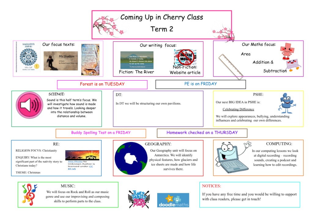 Homework – Children are to learn their personal spellings, read a minimum of 3 times a week (recorded in their reading log), complete a scrapbook style journal entry and complete 10 minutes of Doodle Maths or Doodle Tables. Ideally, children need to practise their times tables as often as possible.