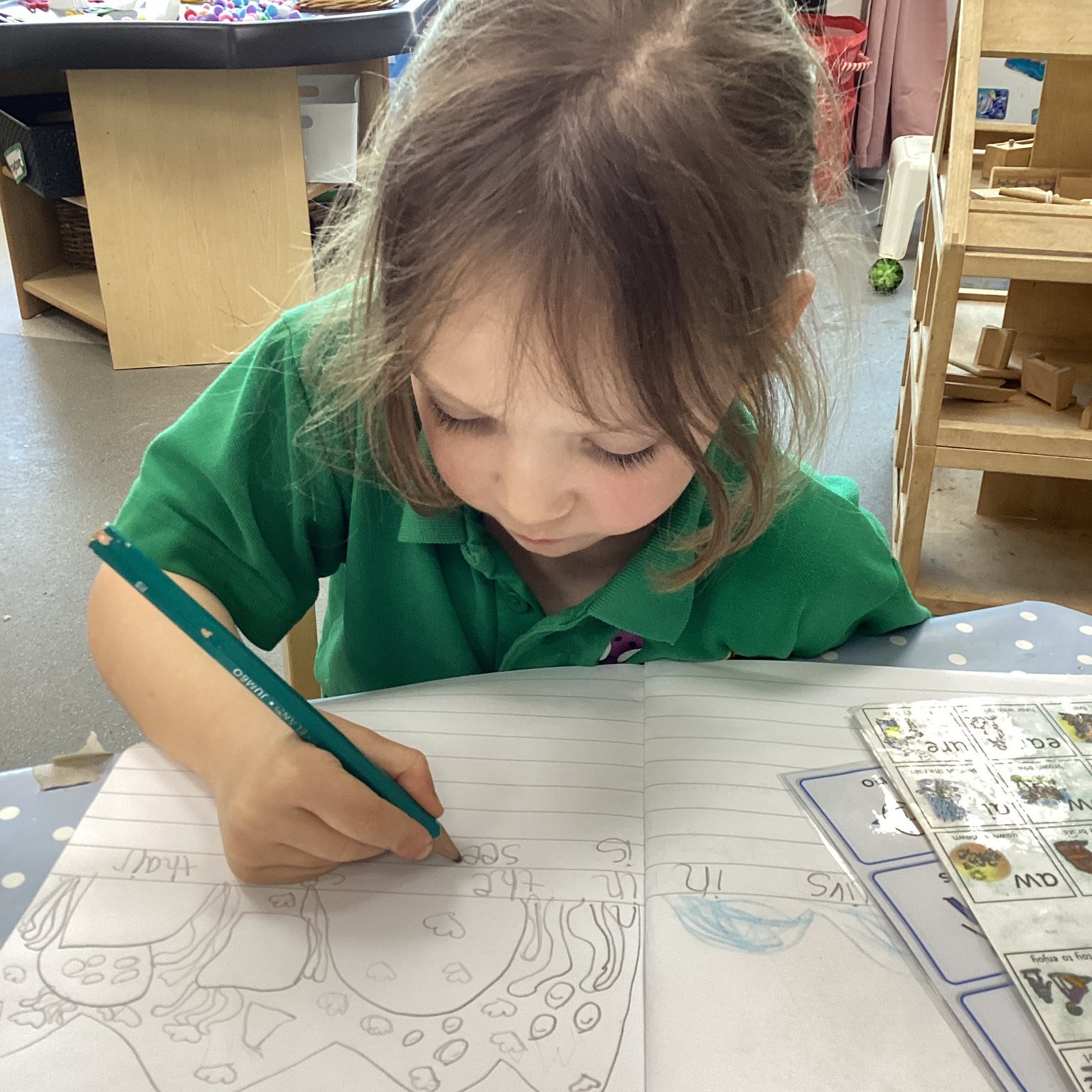 Our Drawing Club sessions have been a real highlight. We have enjoyed sharing stories such as Aliens Love Underpants, Beegu (even spotting the “grotty grapheme”!), and Commotion in the Ocean. These stories have inspired our creativity and supported the development of our writing. We have been working hard to apply our phonics knowledge and are becoming more confident in remembering to use full stops at the end of our sentences after holding them in our heads more independently.