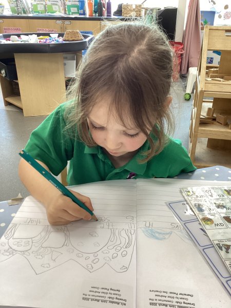 In Drawing Club, we have focused on Traditional Tales with a twist, including Goldilocks and the Three Crocodiles, Three Billy Goats Fluff and The Great Gran Plan. We have explored the characters and settings in each story and the children have been incredibly creative during Adventure Time. We have been working hard on writing full sentences and remembering to add a full stop at the end. Some of us are now writing much more independently which is great!