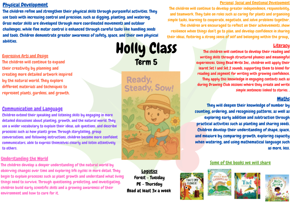 Another busy and exciting term has flown by in Holly Class and we are so proud of everything the children have achieved. In phonics, we have now finished learning our Set 1 sounds and have moved on to Set 2 sounds. The children are now learning digraphs and trigraphs and are growing in confidence every day with their reading and writing. We have also been practising our red words, which include a grotty grapheme, which we know we just have to learn by sight.