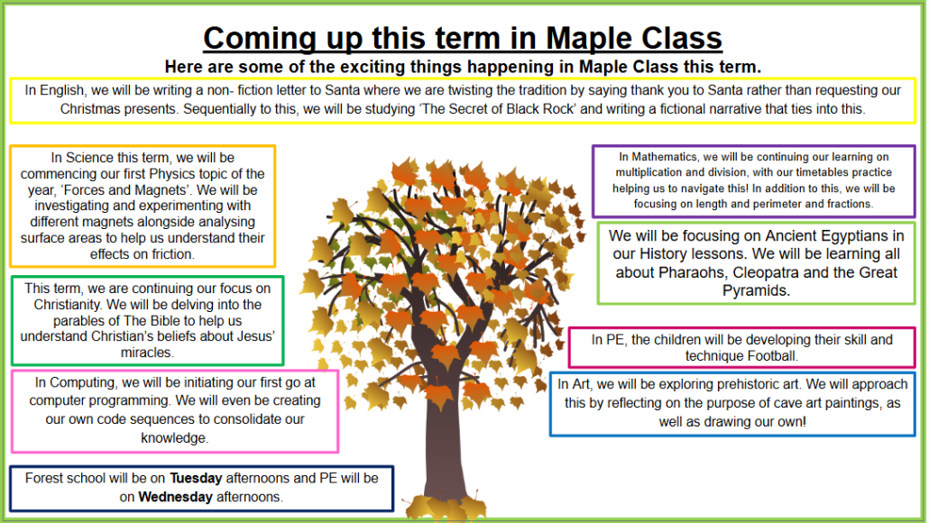 I look forward to another brilliant term with Maple Class! I hope you all have a relaxing half term break.